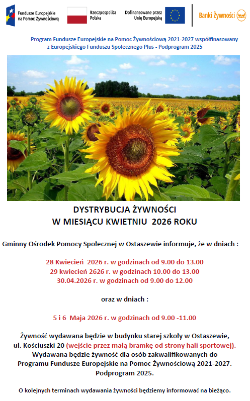 W budynku starej szkoły w Ostaszewie, ul. Kościuszki 20 ( wejście przez małą bramkę od strony hali sportowej ) będzie wydawana żywność dla osób zakwalifikowanych do Programu 2021 w ramach